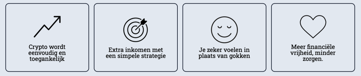 Dit betekent dat je geen standaard advies krijgt, maar begeleiding die precies past bij waar jij staat in je crypto-reis en wat jij wilt bereiken. Samen zorgen we ervoor dat jij je zeker voelt over elke stap die je zet.